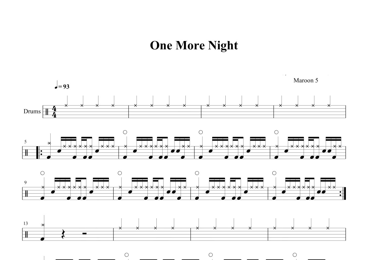 《One More Night》是Maroon 5演唱的一首歌曲,这份鼓谱共有两张高清图谱,图谱由 @打鼓谱 编配上传,图谱使用五线谱编配,使用这份One More Night架子鼓谱,你将能够轻松地敲打出这首Maroon 5的One More Night,快来尝试吧。