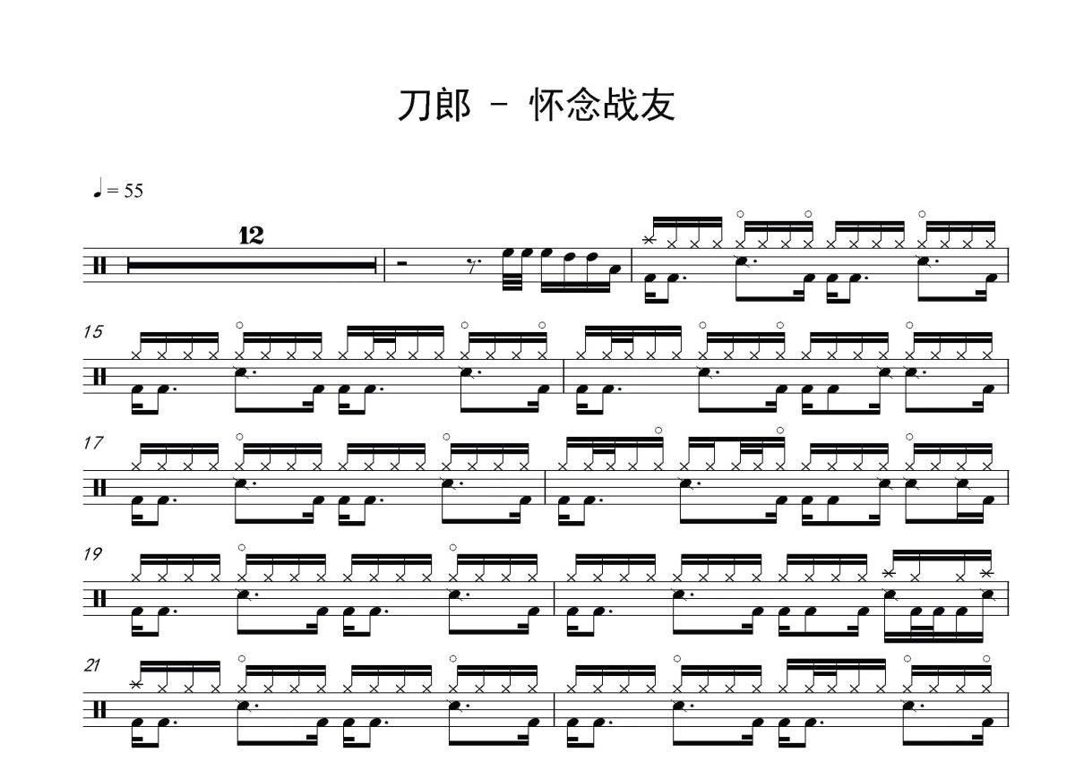 《怀念战友》是刀郎演唱的一首歌曲,这份鼓谱共有两张高清图谱,图谱由 @打鼓谱 编配上传,图谱使用五线谱编配,使用这份怀念战友架子鼓谱,你将能够轻松地敲打出这首刀郎的怀念战友,快来尝试吧。《怀念战友》是由雷振邦创作词曲,李世荣演唱的歌曲,亦是电影《冰山上的来客》的插曲,发行于1963年。 2005年7月5日,该歌曲被中国文学艺术界联合会和中国电影家协会评为中国电影百年百首金曲。