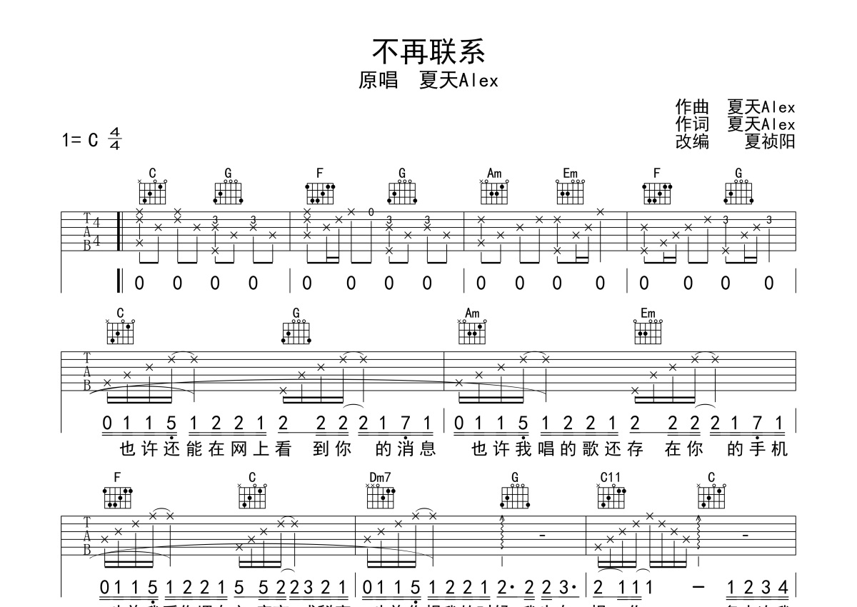 《不再联系》是夏天Alex/崔子格演唱的一首歌曲,本吉他谱采用的是C调指法编配,这份吉他谱共有三张高清图谱,图谱由 @梦马音乐官方 编配上传,图谱使用六线谱编配,包含吉他和弦指法、简谱以及歌词部分,曲谱配备了相关的视频提供浏览,使用这份不再联系吉他谱,可以让你更加方便地掌握这首歌曲的弹唱技巧,快来尝试吧。夏天Alex词曲演唱的一首治愈系情歌,夏祯阳老师编配并为琴友们《不再联系》吉他弹唱演示视频。要点讲解:一首简单难度的弹唱歌曲,原曲编曲也很简单,感觉就是用键盘简单弹了一下,再配了常规的几大件乐器。和弦分解都很容易听出来。但是老师并没有完全按照原版来编分解和和弦,更多的加入了自己对这首歌的旋律编配的理解。