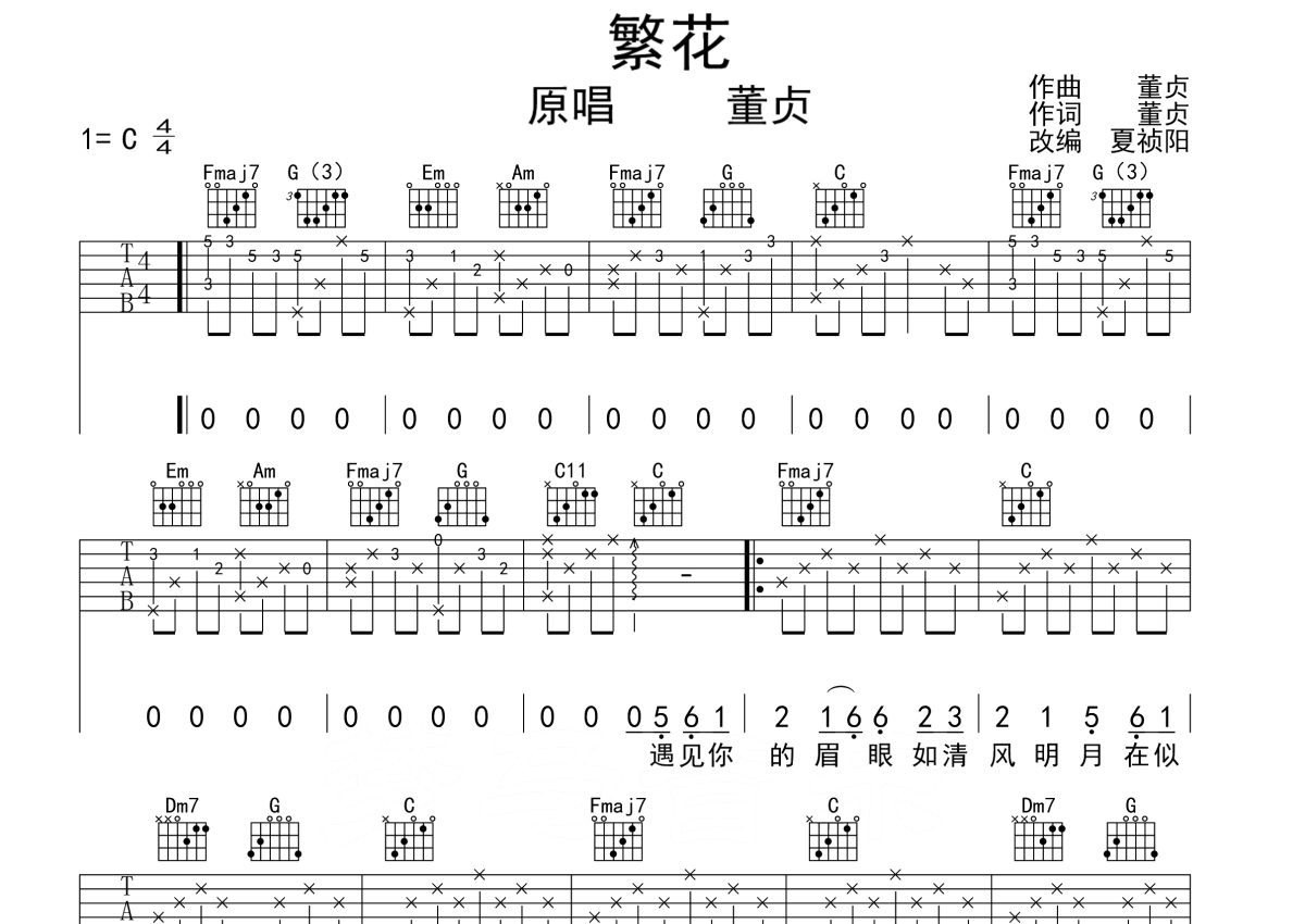 董贞《繁花》吉他谱 - C调弹唱六线谱
