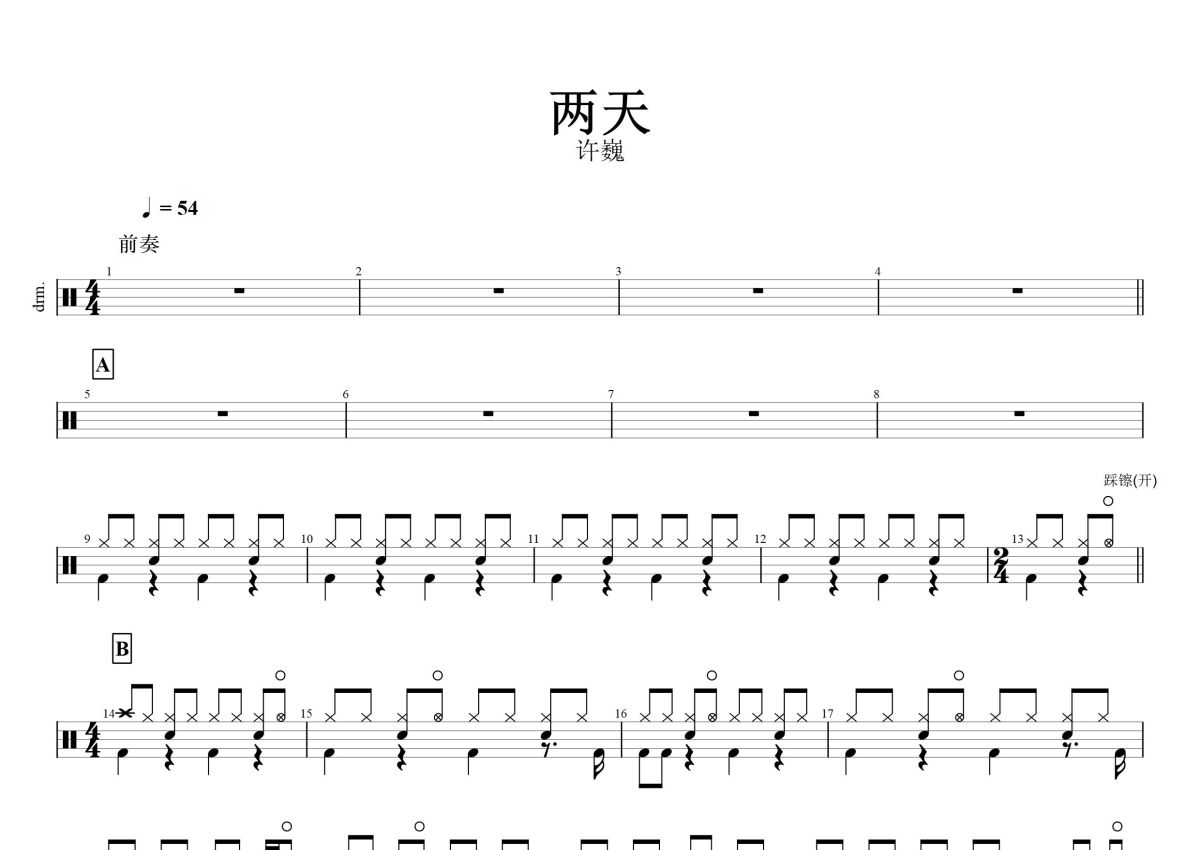 《两天》是许巍演唱的一首歌曲,这份鼓谱共有两张高清图谱,图谱由 @打鼓谱 编配上传,图谱使用五线谱编配,使用这份两天架子鼓谱,你将能够轻松地敲打出这首许巍的两天,快来尝试吧。《两天》是由许巍作词作曲,许巍演唱的一首歌曲,收录在专辑《我只有两天-许巍精选》中。这首歌是一首摇滚风格的歌曲。歌曲展现了许巍的高超唱功和创作才能。和崔健的《一无所有》入选了《中国当代诗歌文选》,是入选诗歌文选仅有的两首流行音乐。