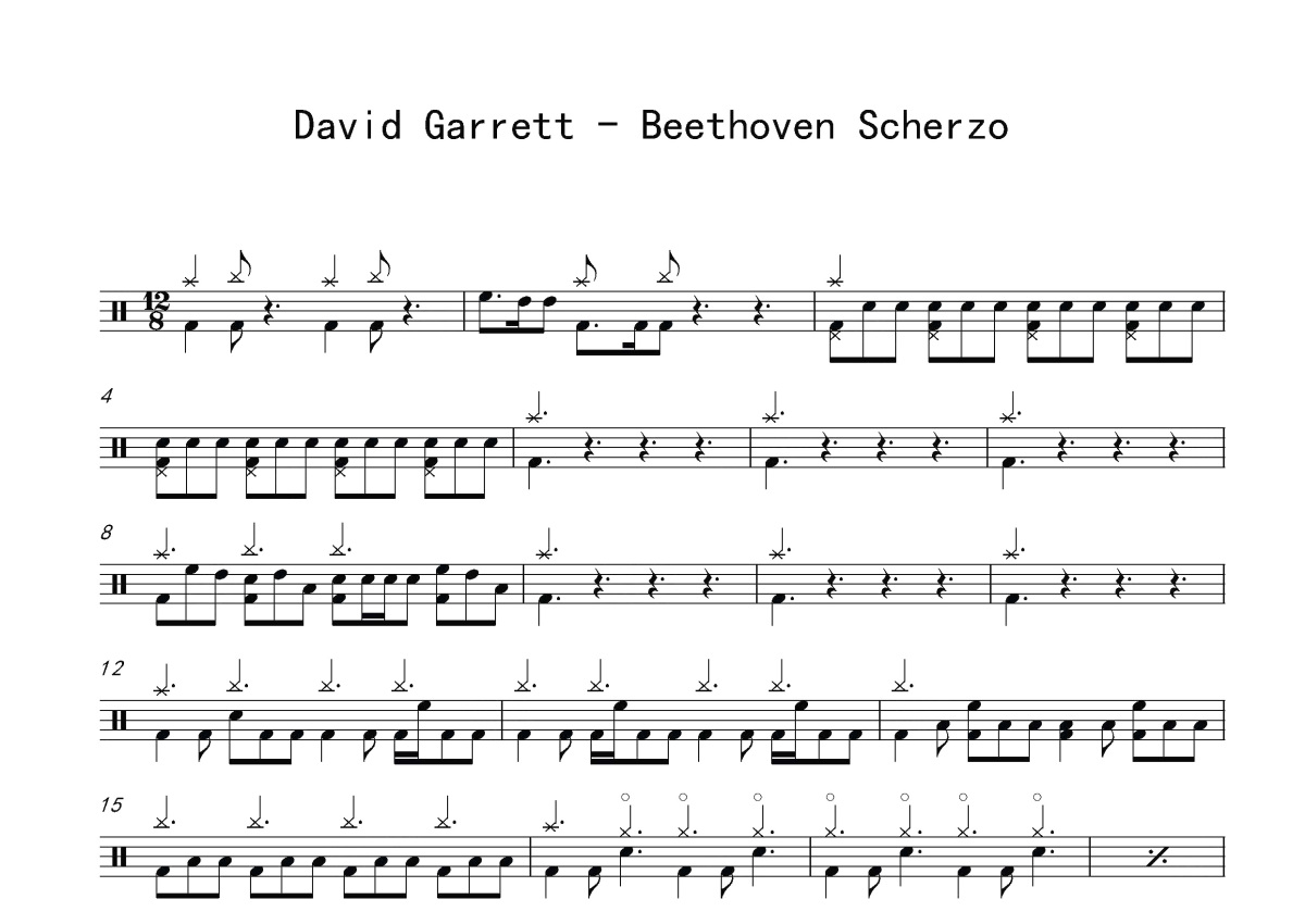 《Beethoven Scherzo》是David Garrett(大卫·葛瑞特)演唱的一首歌曲,这份鼓谱共有两张高清图谱,图谱由 @打鼓谱 编配上传,图谱使用五线谱编配,使用这份Beethoven Scherzo架子鼓谱,你将能够轻松地敲打出这首David Garrett(大卫·葛瑞特)的Beethoven Scherzo,快来尝试吧。《Beethoven Scherzo》现场版。David Garrett(大卫·葛瑞特),1980年9月4日出生于德国亚琛,小提琴家、模特、演员、作曲家。