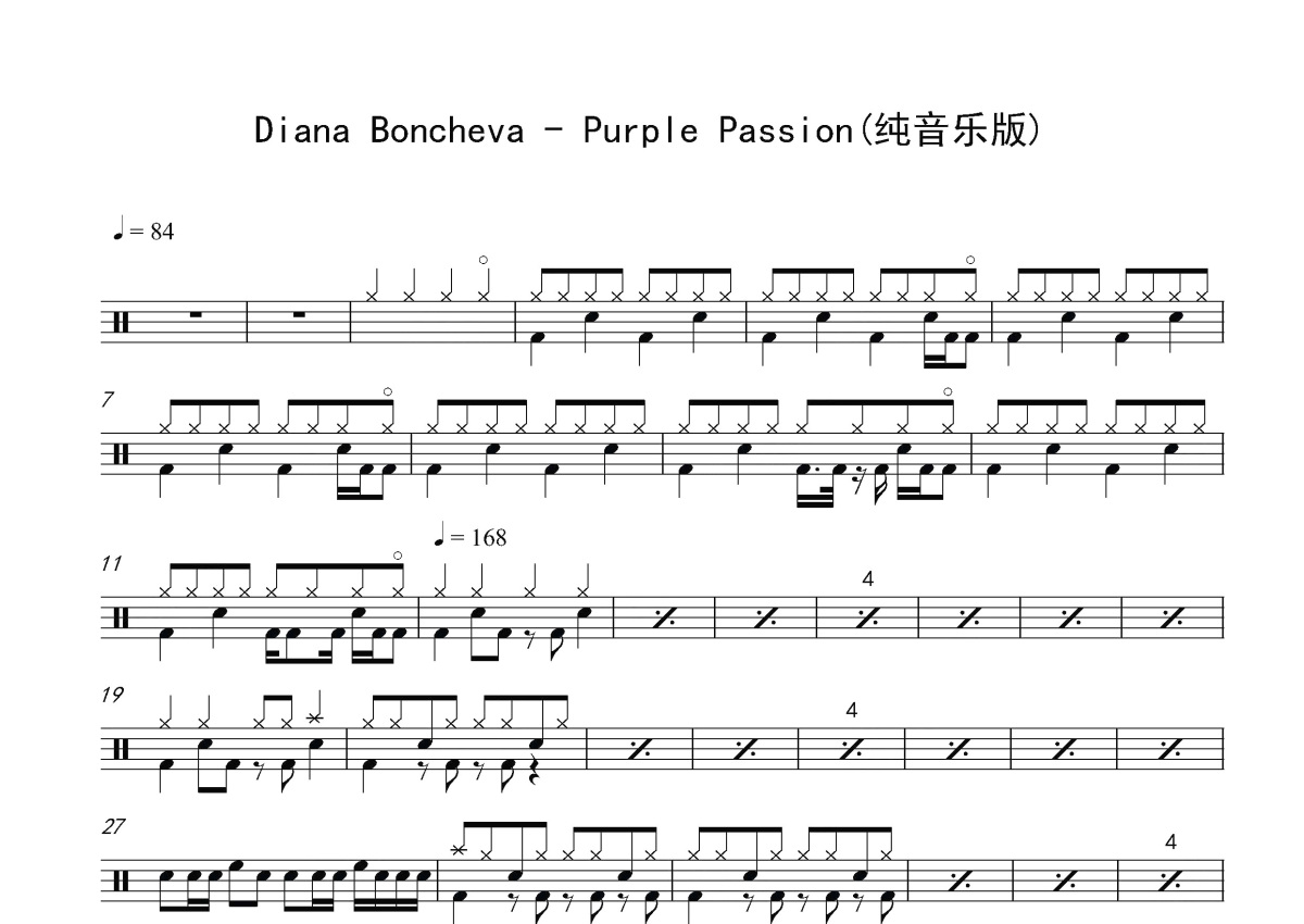 《Purple Passion》是Diana Boncheva演唱的一首歌曲,纯音乐版,这份鼓谱共有两张高清图谱,图谱由 @打鼓谱 编配上传,图谱使用五线谱编配,使用这份Purple Passion架子鼓谱,你将能够轻松地敲打出这首Diana Boncheva的Purple Passion,快来尝试吧。《Purple Passion》Diana Boncheva同名电子小提琴曲(纯音乐版)。保加利亚著名电子小提琴家。在韩国的世界杯电子竞技大赛中演奏了曲子Beethoven Virus受到很多人的欢迎。 Diana Boncheva是保加利亚著名电子小提琴家。在韩国的世界杯电子竞技大赛中演奏了曲子Beethoven Virus受到很多人的欢迎,主要音乐作品有《Beethoven Virus》、《Purple Passion》等。