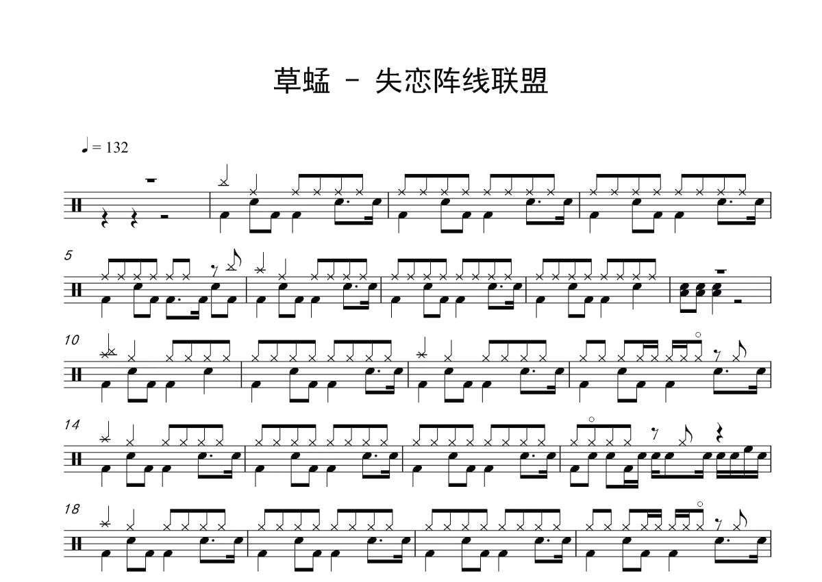 《失恋阵线联盟》是草蜢乐队演唱的一首歌曲,这份鼓谱共有两张高清图谱,图谱由 @打鼓谱 编配上传,图谱使用五线谱编配,使用这份失恋阵线联盟架子鼓谱,你将能够轻松地敲打出这首草蜢乐队的失恋阵线联盟,快来尝试吧。《失恋阵线联盟》是中国香港演唱组合草蜢演唱的一首歌曲,由Cha Trikong Suwan作曲,何启弘作词,改编自泰国歌手Bird Thongchai演唱的歌曲《Ku Gad》,收录在草蜢1990年10月18日由环球唱片发行的普通话专辑《失恋阵线联盟》中 。该歌曲是电视剧《家有仙妻》的主题曲,2015年被电影《我的少女时代》作为片尾曲。
