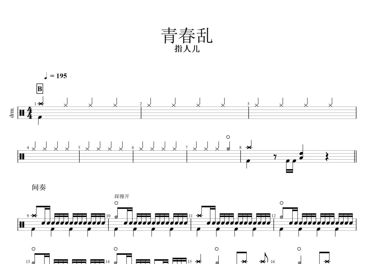 指人儿《青春乱》鼓谱 - 架子鼓谱