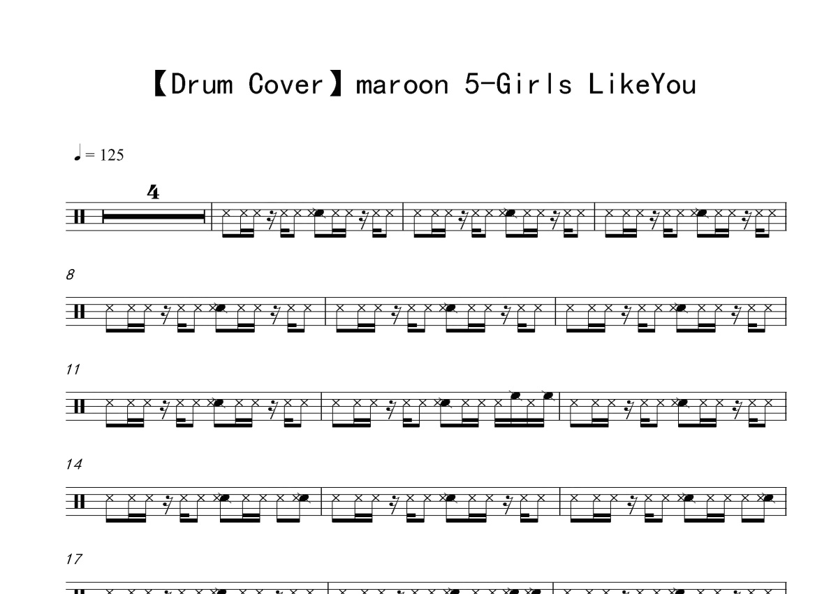 《Girls Like You》是maroon 5演唱的一首歌曲,这份鼓谱共有四张高清图谱,图谱由 @打鼓谱 编配上传,图谱使用五线谱编配,使用这份Girls Like You架子鼓谱,你将能够轻松地敲打出这首maroon 5的Girls Like You,快来尝试吧。《Girls Like You》是美国流行乐队魔力红演唱的歌曲,由亚当·莱文、Cirkut、卡迪·B、Starrah等填词并谱曲,收录于魔力红第六张录音室专辑《Red Pill Blues》中。2018年5月30日,与美国说唱女歌手卡迪·B合作的混音版发行 [1] 。9月24日,该单曲登顶美国公告牌百强单曲榜,成为魔力红的第四支冠单 [1] 。