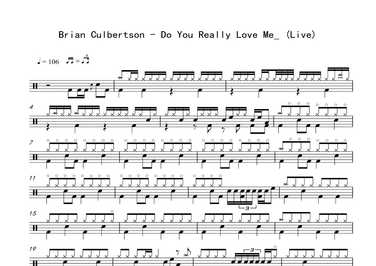 《Do You Really Love Me》是Brian Culbertson演唱的一首歌曲,这份鼓谱共有三张高清图谱,图谱由 @打鼓谱 编配上传,图谱使用五线谱编配,使用这份Do You Really Love Me架子鼓谱,你将能够轻松地敲打出这首Brian Culbertson的Do You Really Love Me,快来尝试吧。Do You Really Love Me
