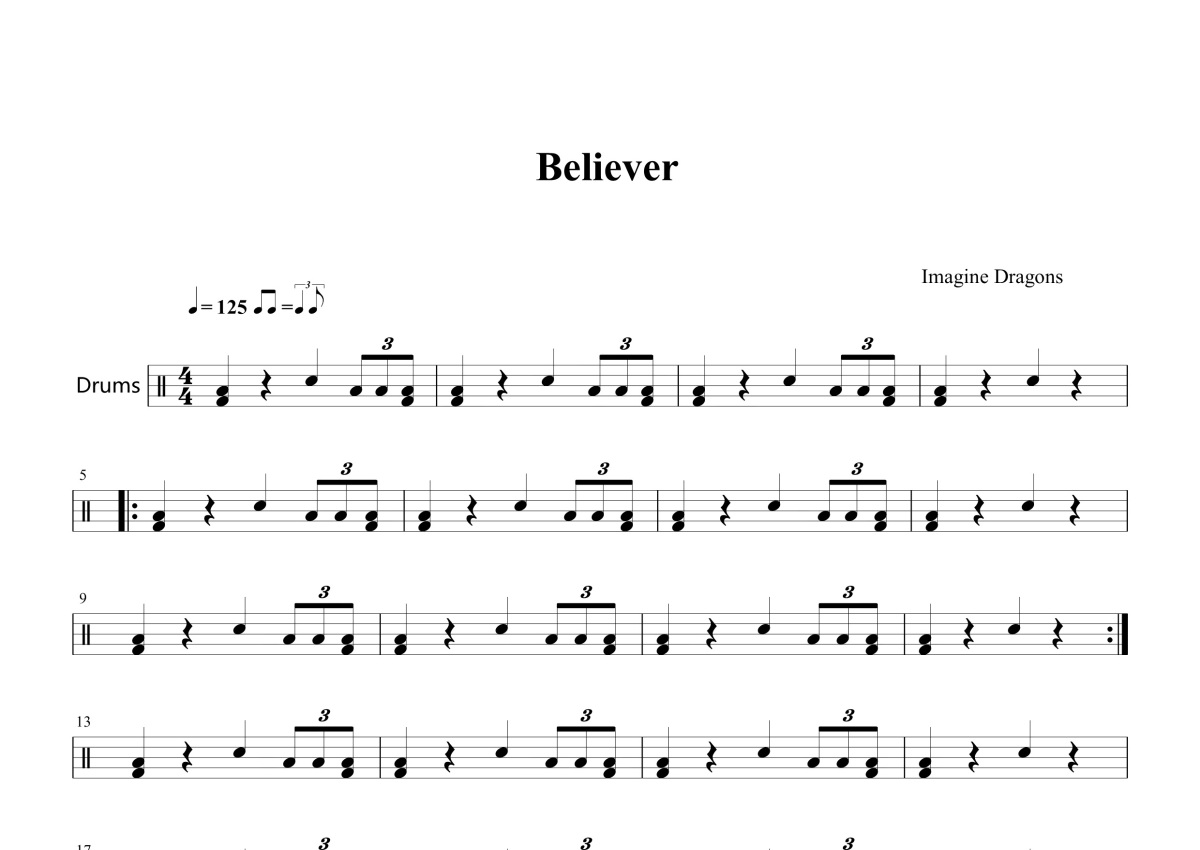 《Believer》是Imagine Dragons演唱的一首歌曲,这份鼓谱共有三张高清图谱,图谱由 @打鼓谱 编配上传,图谱使用五线谱编配,使用这份Believer架子鼓谱,你将能够轻松地敲打出这首Imagine Dragons的Believer,快来尝试吧。《Believer》是美国摇滚乐队Imagine Dragons的一首歌曲,由Imagine Dragons、Robin Fredrikkson、贾斯汀·特兰特和马蒂亚斯·拉尔森创作,发行于2017年2月1日,收录于Imagine Dragons2017... 。
