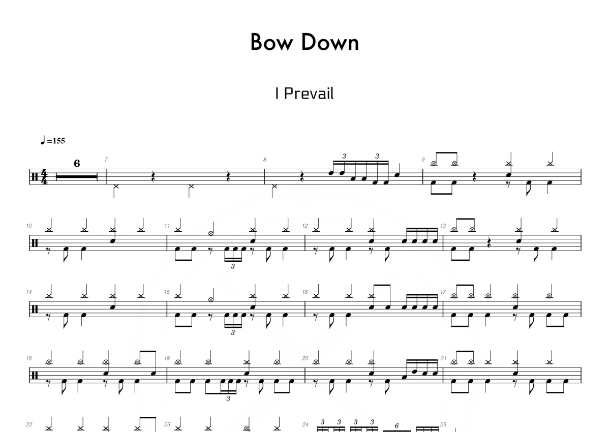 《Bow Down》是I Prevail演唱的一首歌曲,这份鼓谱共有四张高清图谱,图谱由 @打鼓谱 编配上传,图谱使用五线谱编配,使用这份Bow Down架子鼓谱,你将能够轻松地敲打出这首I Prevail的Bow Down,快来尝试吧。 I Prevail 专辑:TRAUMA (Explicit)发行时间:2019-03-29 Bow Down (Explicit) - I Prevail Lyrics by:Brian Burkheiser/Steve Menoian/Eric Vanlerberghe Compos...。