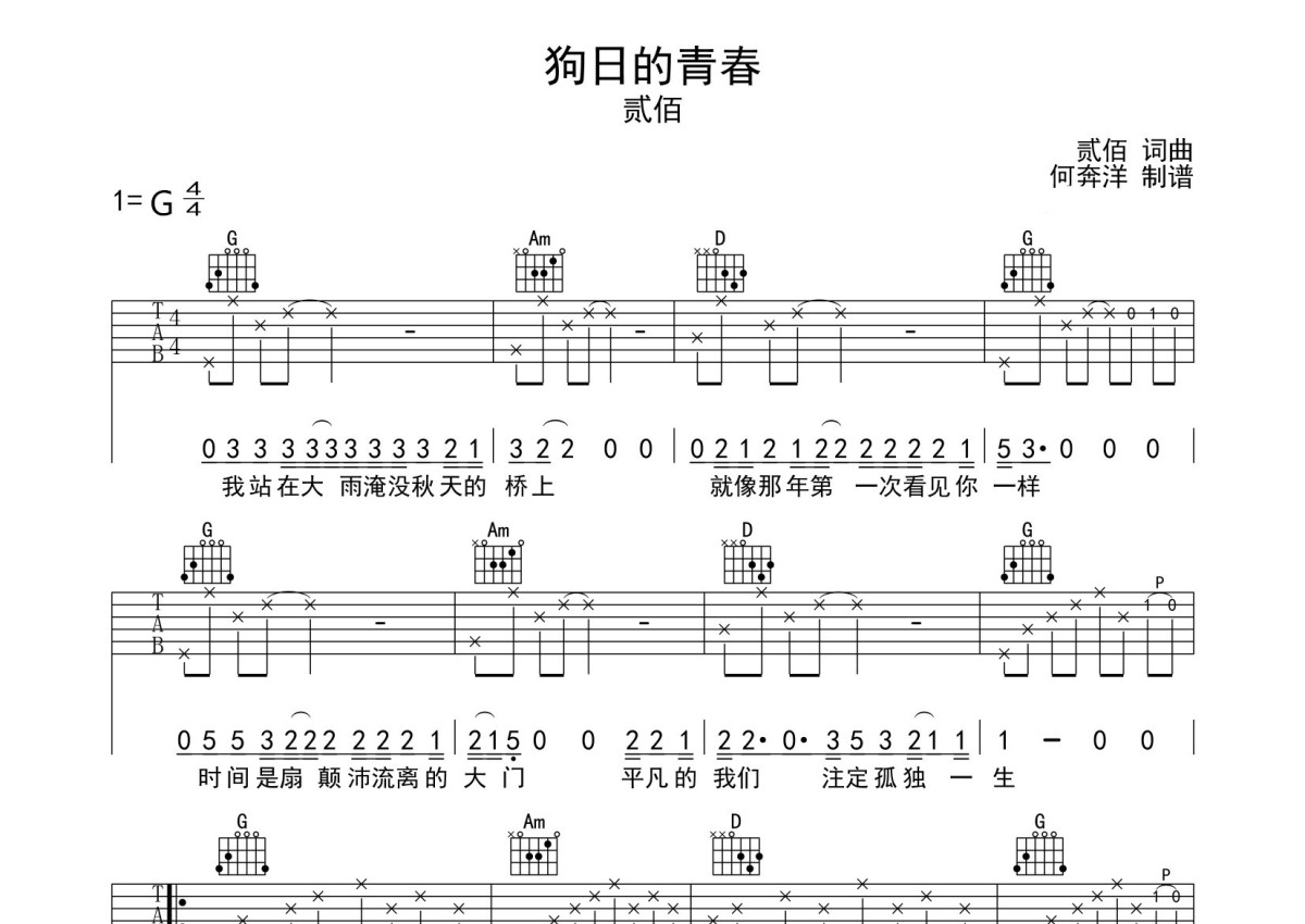 贰佰《狗日的青春》吉他谱 - G调弹唱六线谱