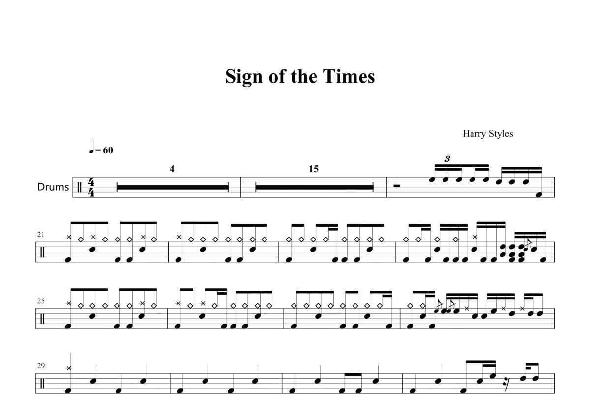 《Sign of the Times》是Harry Styles演唱的一首歌曲,这份鼓谱共有两张高清图谱,图谱由 @打鼓谱 编配上传,图谱使用五线谱编配,使用这份Sign of the Times架子鼓谱,你将能够轻松地敲打出这首Harry Styles的Sign of the Times,快来尝试吧。《Sign of the Times》是哈里·斯泰尔斯演唱的歌曲,由亚历克斯·萨利比安、杰夫·巴斯科尔、哈里·斯泰尔斯、泰勒·约翰逊、瑞安·纳西、米奇·罗兰完成词曲,杰夫·巴斯科尔、亚历克斯·... 。