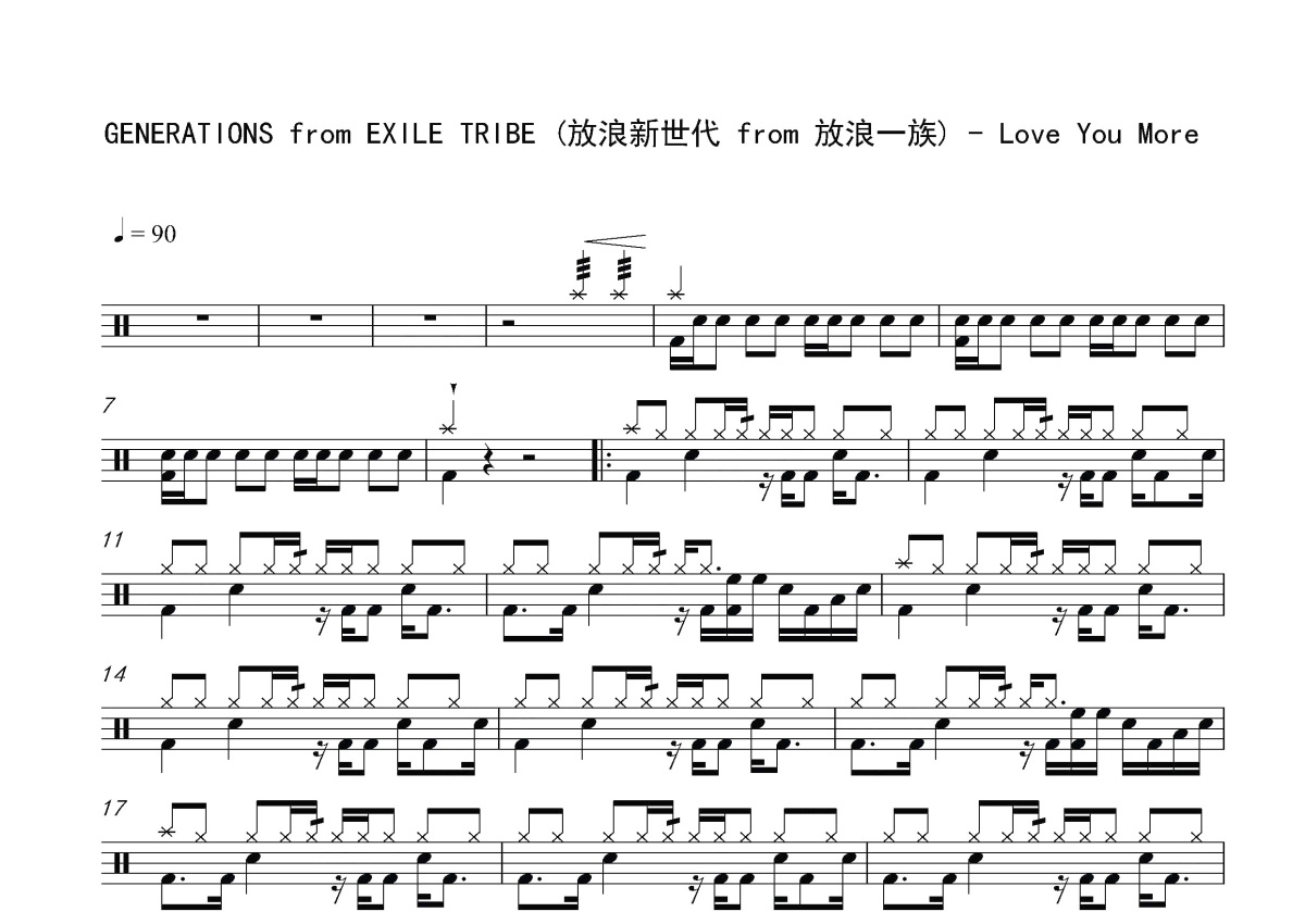 《love you more》是GENERATIONS from EXILE TRIBE (放浪新世代 from 放浪一族)演唱的一首歌曲,这份鼓谱共有两张高清图谱,图谱由 @打鼓谱 编配上传,图谱使用五线谱编配,使用这份love you more架子鼓谱,你将能够轻松地敲打出这首GENERATIONS from EXILE TRIBE (放浪新世代 from 放浪一族)的love you more,快来尝试吧。《love you more》现场版。GENERATIONS from EXILE TRIBE,日本流行乐男子舞蹈&演唱组合,由白滨亚岚、片寄凉太、数原龙友、小森隼、佐野玲于、关口MANDY、中务裕太组成。