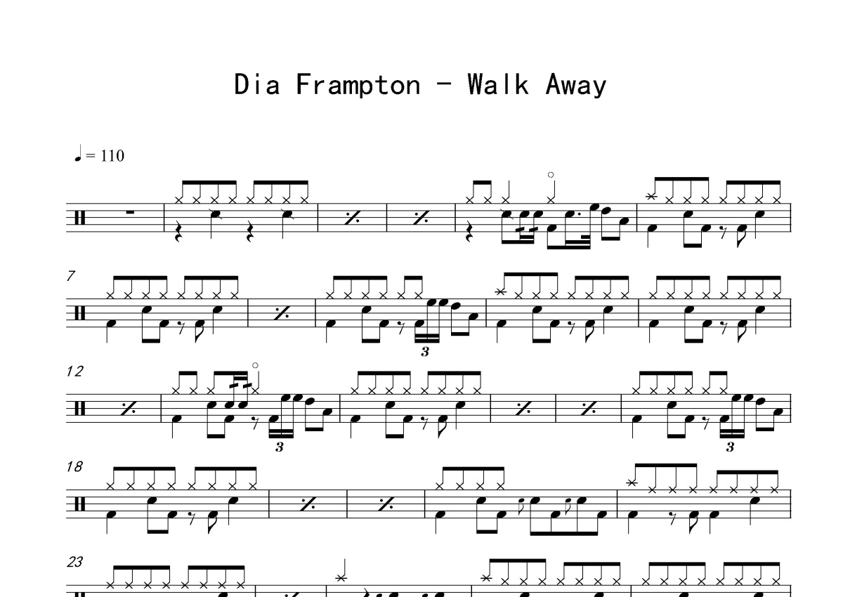 《Walk Away》是Dia Frampton演唱的一首歌曲,这份鼓谱共有两张高清图谱,图谱由 @打鼓谱 编配上传,图谱使用五线谱编配,使用这份Walk Away架子鼓谱,你将能够轻松地敲打出这首Dia Frampton的Walk Away,快来尝试吧。《Walk Away》是美国著名流行女歌手与歌曲创作人Kelly Clarkson为个人第二张录音室专辑《Breakaway》发行的第五支单曲。单曲最高全美排位第12名,成人抒情榜排名第2。2006年年榜排名第45位。这首歌也受到了广泛好评,称其为一首“经典的流行摇滚歌曲”。另有Blue、范逸臣等多首同名曲。