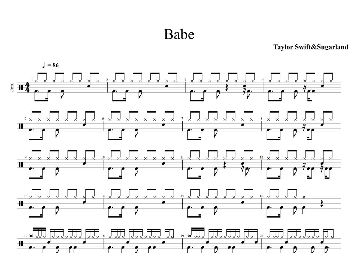 《babe》是sugarland演唱的一首歌曲,这份鼓谱共有两张高清图谱,图谱由 @打鼓谱 编配上传,图谱使用五线谱编配,使用这份babe架子鼓谱,你将能够轻松地敲打出这首sugarland的babe,快来尝试吧。 这首babe是由泰勒和 Patrick Monahan联合创作的,也是泰勒red专辑的一首弃曲。sugarland组合自从2012解散后今年再次重新团聚,泰勒对此十分高兴并打算邀请sugarla...。