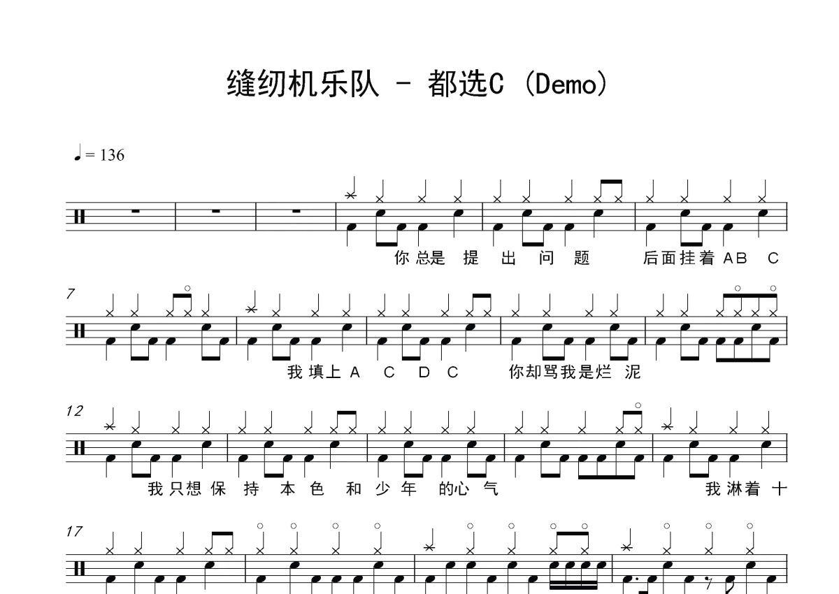 《都选C》是缝纫机乐队演唱的一首歌曲,这份鼓谱共有三张高清图谱,图谱由 @打鼓谱 编配上传,图谱使用五线谱编配,使用这份都选C架子鼓谱,你将能够轻松地敲打出这首缝纫机乐队的都选C,快来尝试吧。《都选C》是由赵英俊作词作曲,大鹏演唱的歌曲,歌曲电影MV由缝纫机乐队演唱,该歌曲收录于大鹏2017年发行的专辑《都选C》中。