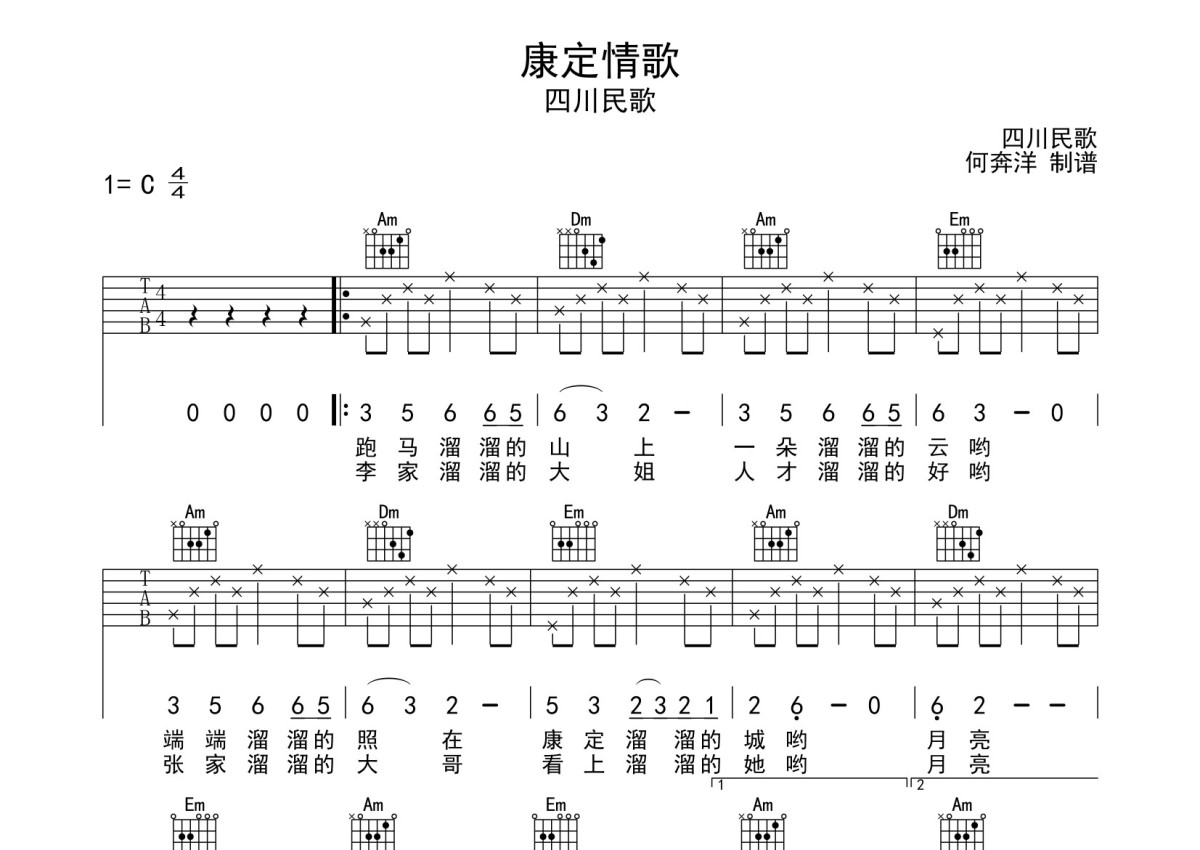 四川民歌《康定情歌》吉他谱 - C调弹唱六线谱