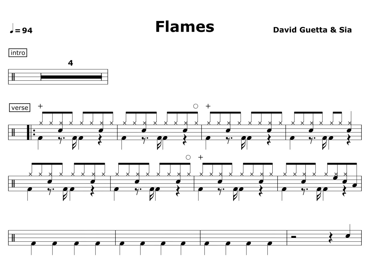 《Flames》是David Guetta/Sia演唱的一首歌曲,这份鼓谱共有一张高清图谱,图谱由 @打鼓谱 编配上传,图谱使用五线谱编配,使用这份Flames架子鼓谱,你将能够轻松地敲打出这首David Guetta/Sia的Flames,快来尝试吧。法国DJ大卫库塔DavidGuetta联手澳洲天后Sia合作新单《Flames》官方超清MV大首播!中国古装武侠片来袭!。