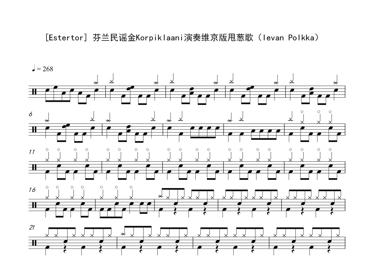 《[Estertor] 芬兰民谣金》是Korpiklaani&Ievan Polkka演唱的一首歌曲,这份鼓谱共有三张高清图谱,图谱由 @打鼓谱 编配上传,图谱使用五线谱编配,使用这份[Estertor] 芬兰民谣金架子鼓谱,你将能够轻松地敲打出这首Korpiklaani&Ievan Polkka的[Estertor] 芬兰民谣金,快来尝试吧。[Estertor] 芬兰民谣金Korpiklaani演奏维京版甩葱歌(Ievan Polkka)