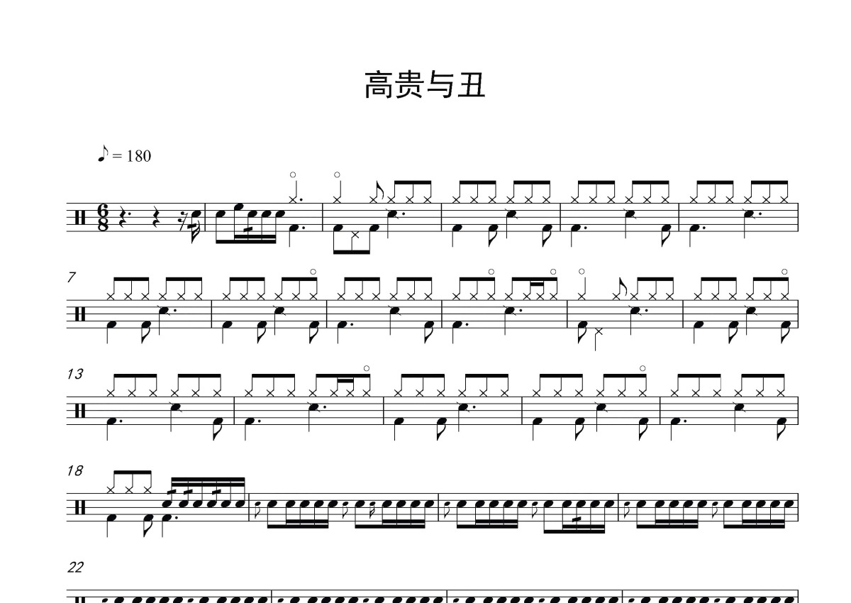 《高贵与丑》是刘凤瑶演唱的一首歌曲,这份鼓谱共有两张高清图谱,图谱由 @打鼓谱 编配上传,图谱使用五线谱编配,使用这份高贵与丑架子鼓谱,你将能够轻松地敲打出这首刘凤瑶的高贵与丑,快来尝试吧。《高贵与丑》是由崔惟楷作词,刘凤瑶作曲并演唱的一首歌曲,收录于2016年刘凤瑶首张同名创作专辑。
