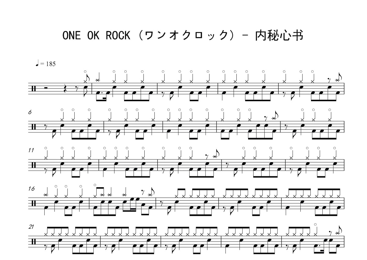 《内秘心书》是ONE OK ROCK (ワンオクロック)演唱的一首歌曲,这份鼓谱共有三张高清图谱,图谱由 @打鼓谱 编配上传,图谱使用五线谱编配,使用这份内秘心书架子鼓谱,你将能够轻松地敲打出这首ONE OK ROCK (ワンオクロック)的内秘心书,快来尝试吧。《内秘心书》现场版。 ONE OK ROCK(ワンオケロック)是一支日本摇滚乐队,于2005年成立,2007年正式出道。凭借扎实的音乐功底,前沿的曲风和热血激昂的现场表现力已稳固发展成为地位超群的实力团体,并受到全球范围内的粉丝追捧。乐队现成员包括主唱Taka、吉他手Toru、贝斯手Ryota、鼓手Tomoya四人。