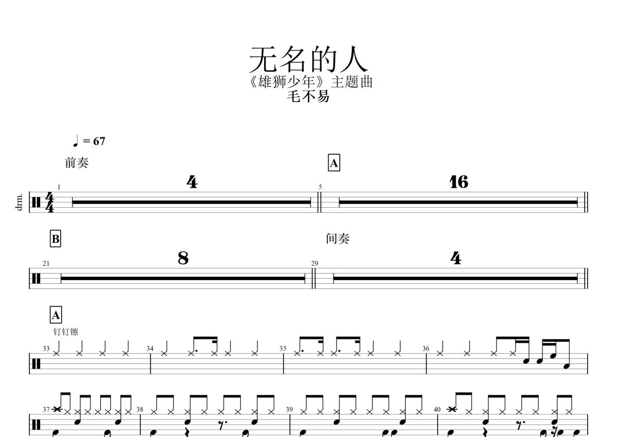 《无名的人》是毛不易演唱的一首歌曲,这份鼓谱共有两张高清图谱,图谱由 @打鼓谱 编配上传,图谱使用五线谱编配,使用这份无名的人架子鼓谱,你将能够轻松地敲打出这首毛不易的无名的人,快来尝试吧。毛不易-无名的人《雄狮少年》电影主题曲。