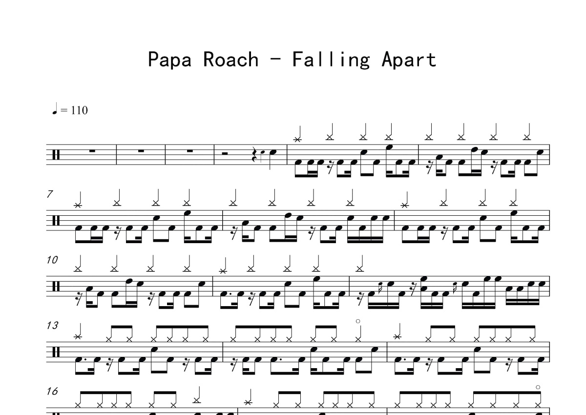 《Falling Apart》是蟑螂老爹/Papa Roach演唱的一首歌曲,这份鼓谱共有两张高清图谱,图谱由 @打鼓谱 编配上传,图谱使用五线谱编配,使用这份Falling Apart架子鼓谱,你将能够轻松地敲打出这首蟑螂老爹/Papa Roach的Falling Apart,快来尝试吧。《Falling Apart》现场版。 蟑螂老爹(Papa Roach)是一组来自美国加利福尼亚州瓦卡维尔的摇滚乐队。由乐队主唱雅各比·沙迪克斯、贝斯手托宾·埃斯佩朗斯、吉他手杰里·霍顿、鼓手托尼·巴勒莫组成。