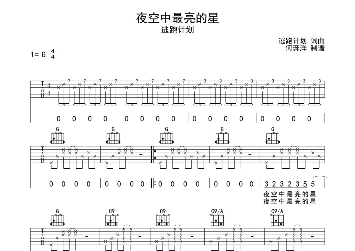 逃跑计划《夜空中最亮的星》吉他谱 - G调弹唱六线谱