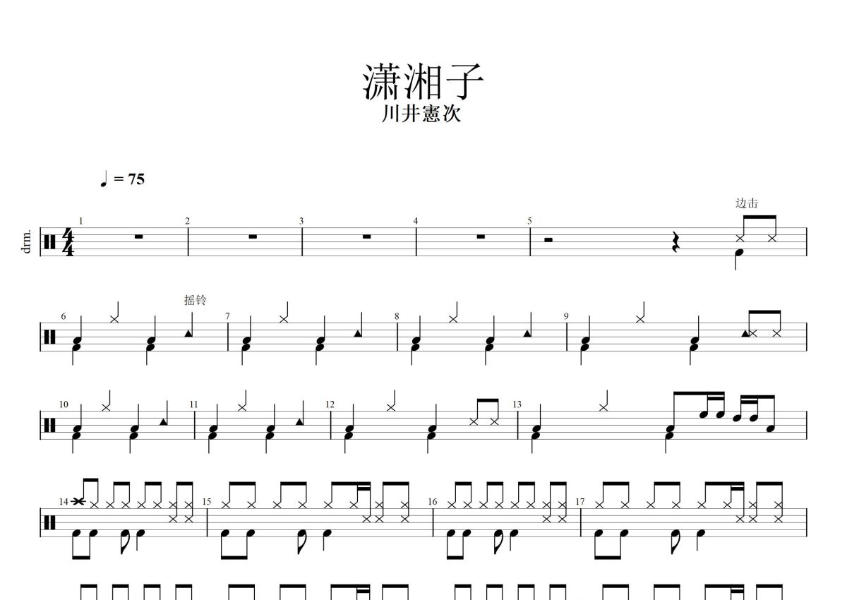 《潇湘子》是川井憲次演唱的一首歌曲,这份鼓谱共有两张高清图谱,图谱由 @打鼓谱 编配上传,图谱使用五线谱编配,使用这份潇湘子架子鼓谱,你将能够轻松地敲打出这首川井憲次的潇湘子,快来尝试吧。潇湘子 - 川井憲次 该歌曲为纯音乐请欣赏。