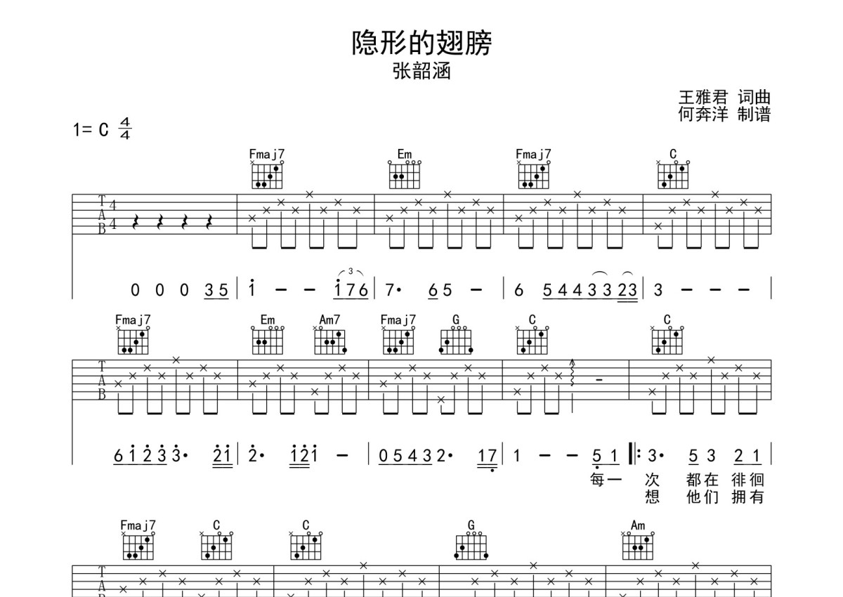 《隐形的翅膀》是张韶涵演唱的一首歌曲,本吉他谱采用的是C调指法编配,这份吉他谱共有两张高清图谱,图谱由 @何奔洋 编配上传,图谱使用六线谱编配,包含吉他和弦指法、简谱以及歌词部分,使用这份隐形的翅膀吉他谱,可以让你更加方便地掌握这首歌曲的弹唱技巧,快来尝试吧。张韶涵《隐形的翅膀》吉他谱_C调吉他弹唱谱。