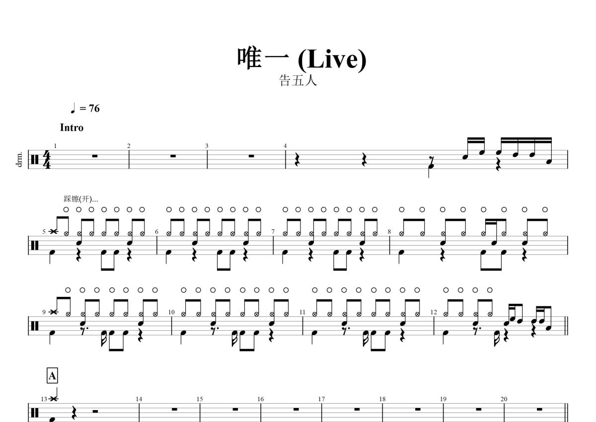告五人《唯一》鼓谱 - 架子鼓谱 - live