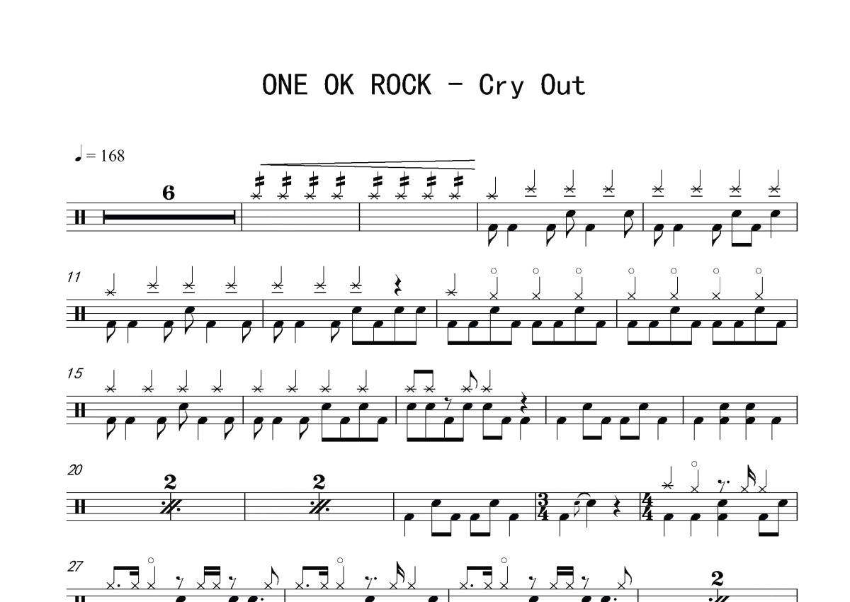 《Cry Out》是ONE OK ROCK演唱的一首歌曲,这份鼓谱共有三张高清图谱,图谱由 @打鼓谱 编配上传,图谱使用五线谱编配,使用这份Cry Out架子鼓谱,你将能够轻松地敲打出这首ONE OK ROCK的Cry Out,快来尝试吧。《Cry Out》是一首由日本摇滚乐队ONE OK ROCK(ワンオケロック)所创作的歌,收录于《35xxxv》专辑中。ONE OK ROCK(ワンオケロック)是一支日本摇滚乐队,于2005年成立,2007年正式出道。凭借扎实的音乐功底,前沿的曲风和热血激昂的现场表现力已稳固发展成为地位超群的实力团体,并受到全球范围内的粉丝追捧。乐队现成员包括主唱Taka、吉他手Toru、贝斯手Ryota、鼓手Tomoya四人。