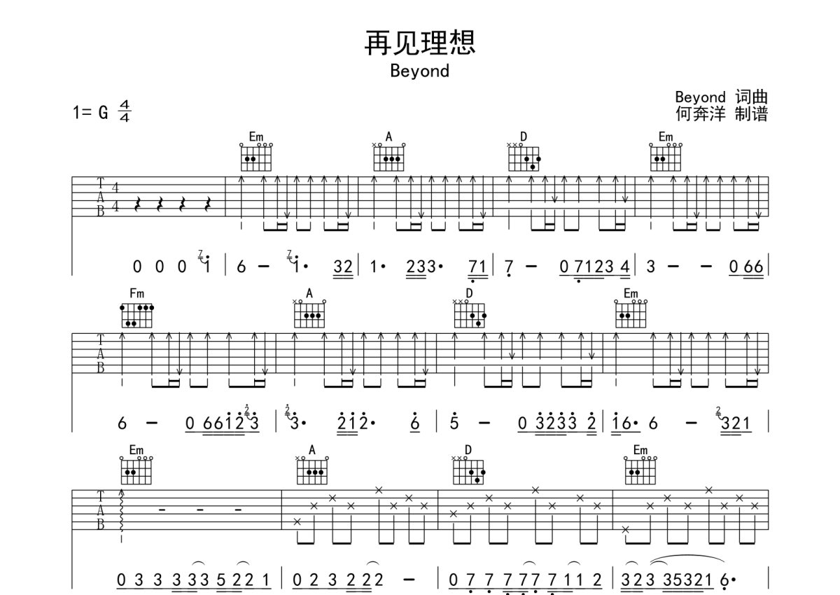 Beyond《再见理想》吉他谱 - G调弹唱六线谱