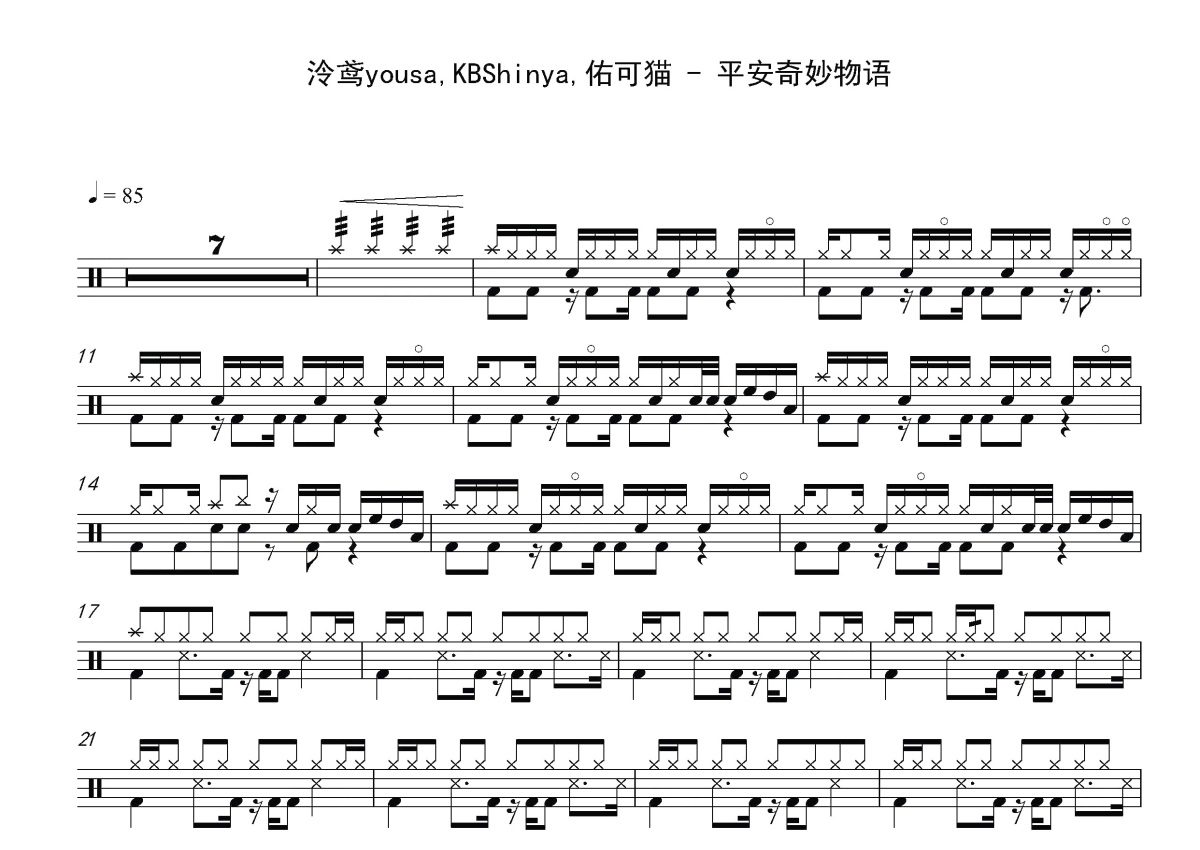 泠鸢yousa/KBShinya/佑可猫《平安奇妙物语》鼓谱 - 架子鼓谱