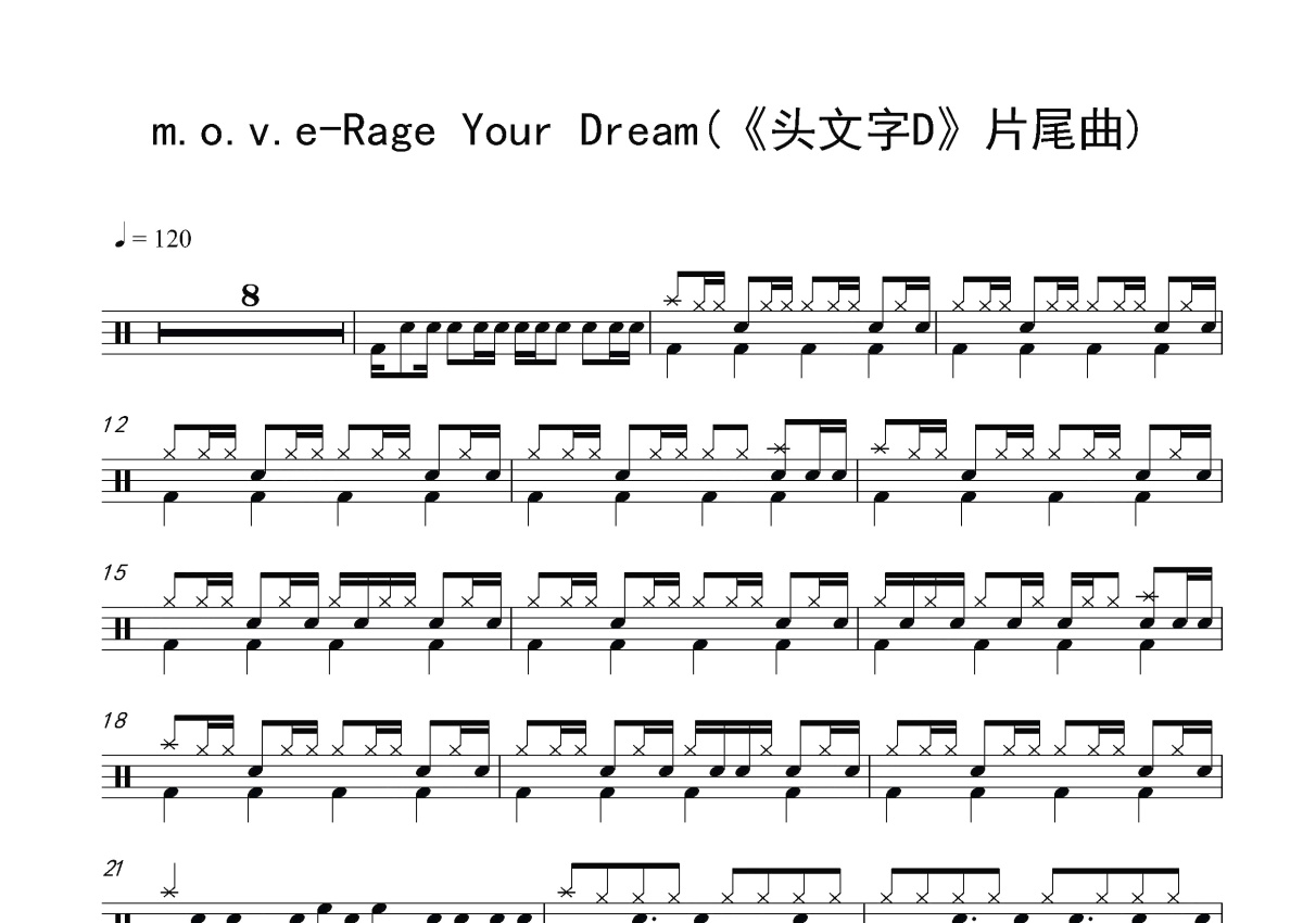 《Rage your dream》是M.O.V.E.演唱的一首歌曲,这份鼓谱共有三张高清图谱,图谱由 @打鼓谱 编配上传,图谱使用五线谱编配,使用这份Rage your dream架子鼓谱,你将能够轻松地敲打出这首M.O.V.E.的Rage your dream,快来尝试吧。《Rage your dream》(《头文字D》片尾曲)是由Motsu作词,Takashi Kimura作曲,M.O.V.E.演唱的歌曲,该歌曲收录于M.O.V.E.于1998年发行的专辑《Rage your dream/around the world》中。 M.O.V.E.是由ORICON,成员之一兼制作人的木村贵志(takashi kimura),加上由热门选秀节目“五花八门浅草挢”出身的女主唱yuri,以及从美国学习音乐舞蹈后返日的motsu所组成。