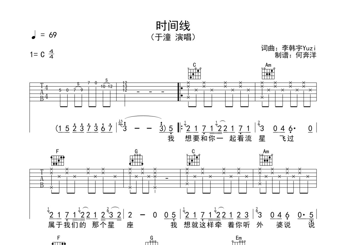 于潼《时间线》吉他谱 - C调弹唱六线谱