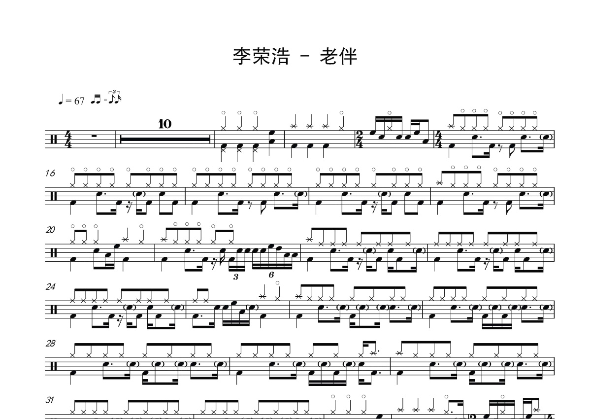 李荣浩《老伴》鼓谱 - 架子鼓谱