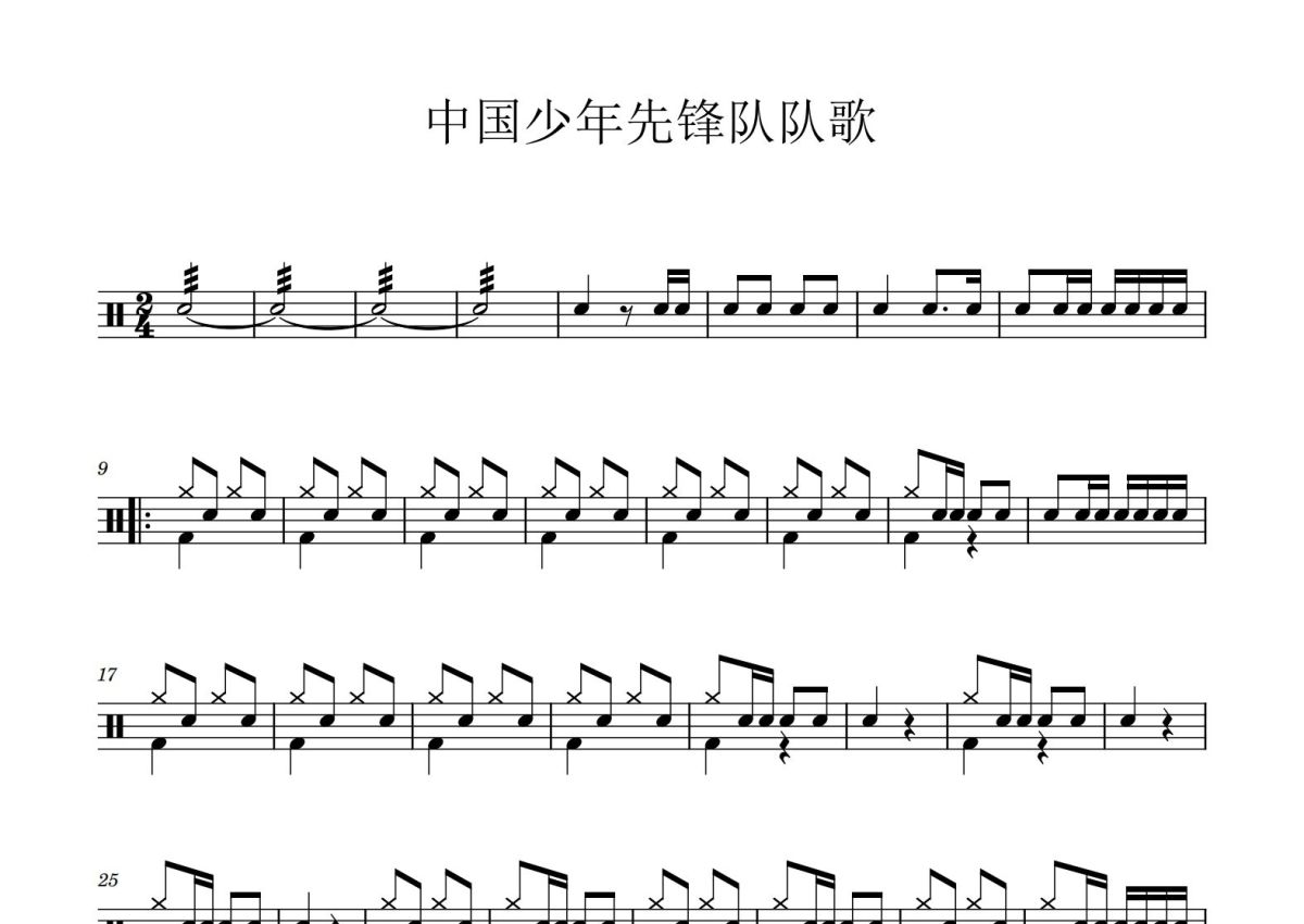 《中国少年先锋队队歌》是少儿演唱的一首歌曲,这份鼓谱共有一张高清图谱,图谱由 @打鼓谱 编配上传,图谱使用五线谱编配,使用这份中国少年先锋队队歌架子鼓谱,你将能够轻松地敲打出这首少儿的中国少年先锋队队歌,快来尝试吧。《中国少年先锋队队歌》是中国少年先锋队的老队歌。1949年10月13日,中国少年先锋队的前身“中国少年儿童队”诞生。1950年4月27日 [1] ,由郭沫若作词,马思聪作曲的《中国少年儿童队队歌》被定为少儿队队歌。 [2] 1953年,中国少年儿童队改名为“中国少年先锋队”,队歌也随后更名为《中国少年先锋队队歌》。1966年“文化大革命”爆发后,少先队组织被迫停止活动,后来曲作者马思聪也出逃美国,此歌便无法再唱。 [3-4] 。