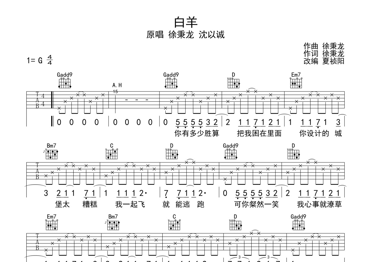 徐秉龙/沈以诚《白羊》吉他谱 - G调弹唱六线谱