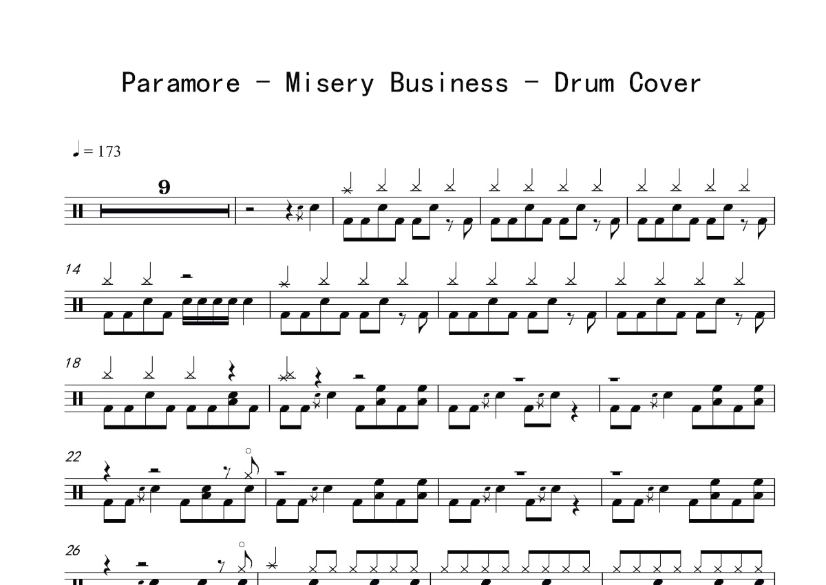 《Misery Business》是Paramore演唱的一首歌曲,这份鼓谱共有三张高清图谱,图谱由 @打鼓谱 编配上传,图谱使用五线谱编配,使用这份Misery Business架子鼓谱,你将能够轻松地敲打出这首Paramore的Misery Business,快来尝试吧。Misery Business是Paramore演唱的一首歌曲。Paramore,美国乐队,于2006年成立。