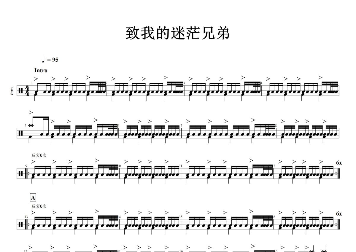 《致我的迷茫兄弟》是声音碎片演唱的一首歌曲,这份鼓谱共有三张高清图谱,图谱由 @打鼓谱 编配上传,图谱使用五线谱编配,使用这份致我的迷茫兄弟架子鼓谱,你将能够轻松地敲打出这首声音碎片的致我的迷茫兄弟,快来尝试吧。《致我的迷茫兄弟》正式上线。这是上一张专辑《把光芒洒向更开阔的地方》发表十年之后,声音碎片的首度发声。它秉承了声音碎片的旋律美学与抒情范式,也更有着新...。