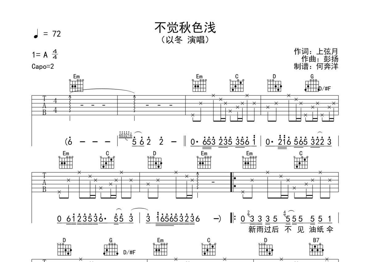 以冬《不觉秋色浅》吉他谱 - G调弹唱六线谱