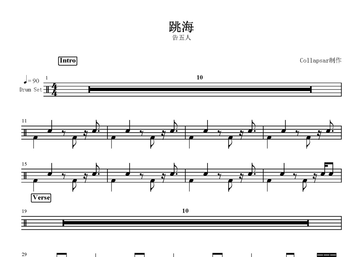 告五人《跳海》鼓谱 - 架子鼓谱