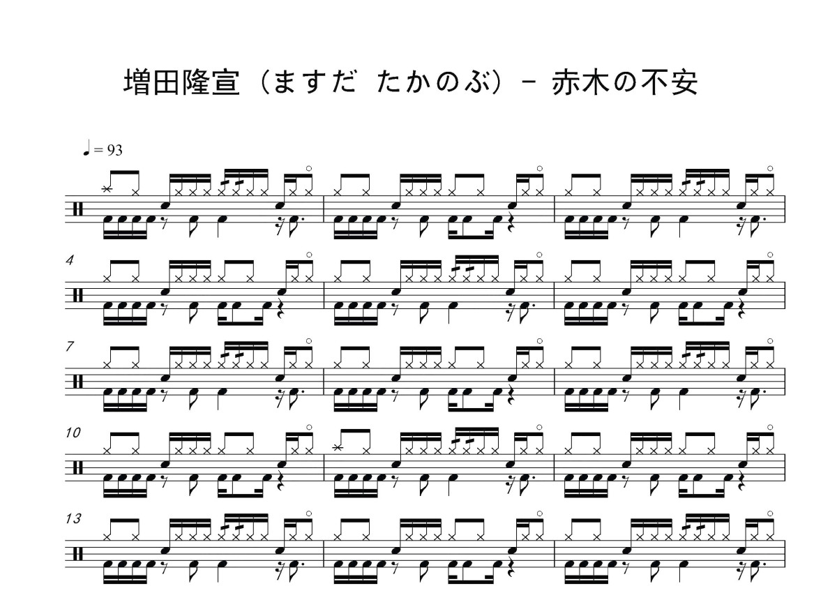 《赤木の不安》是増田隆宣 (ますだ たかのぶ)演唱的一首歌曲,这份鼓谱共有一张高清图谱,图谱由 @打鼓谱 编配上传,图谱使用五线谱编配,使用这份赤木の不安架子鼓谱,你将能够轻松地敲打出这首増田隆宣 (ますだ たかのぶ)的赤木の不安,快来尝试吧。赤木の不安 (赤木的不安)