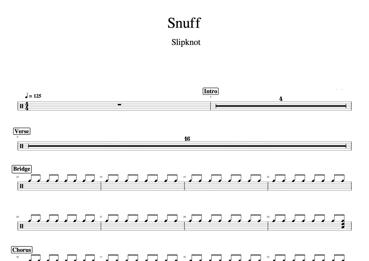 《Snuff》是Slipknot(活结乐队)演唱的一首歌曲,这份鼓谱共有三张高清图谱,图谱由 @打鼓谱 编配上传,图谱使用五线谱编配,使用这份Snuff架子鼓谱,你将能够轻松地敲打出这首Slipknot(活结乐队)的Snuff,快来尝试吧。《Snuff》是由美国金属乐队活结(Slipknot)演唱的一首歌曲,由Corey Taylor、Craig Jones、Paul Gray、Mick Thomson、Joey Jordison、Sid Wilson、Chris Fehn、Jim Root、Shawn "Clown" Crahan作词作曲,收录在他们2008年8月22日发行的的第四张专辑《All Hope Is Gone》中。