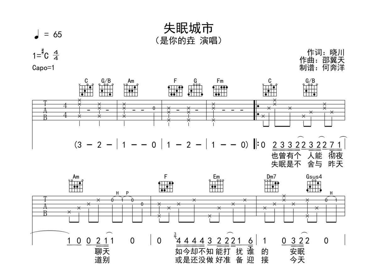 是你的垚《失眠城市》吉他谱 - C调弹唱六线谱