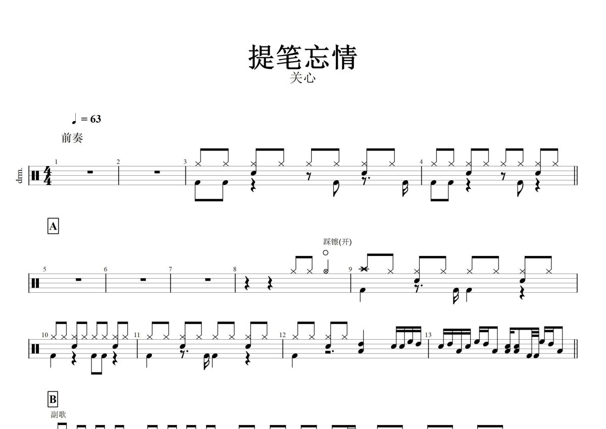 关心《提笔忘情》鼓谱 - 架子鼓谱