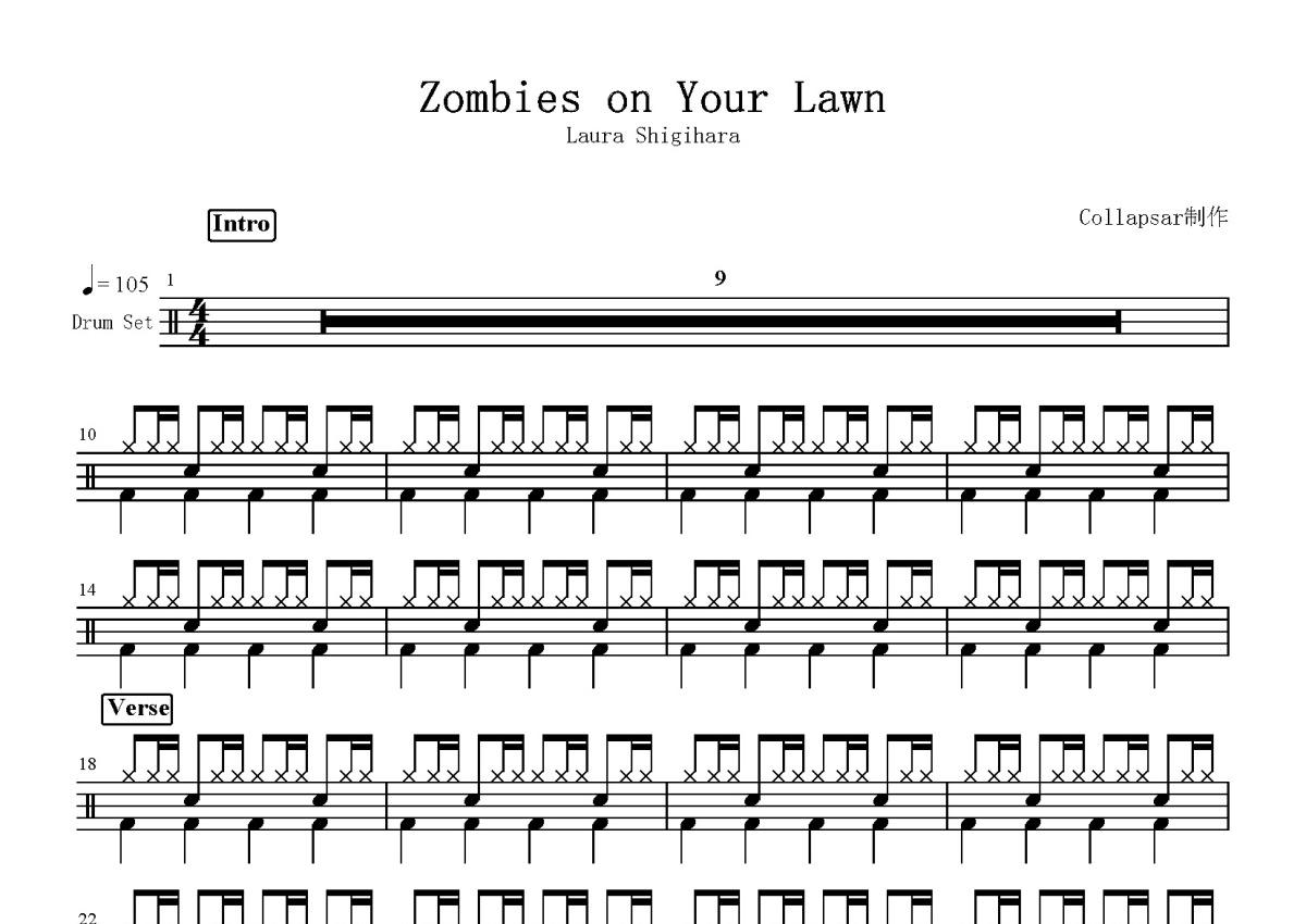 《Zombies on your Lawn》是Laura Shigihara演唱的一首歌曲,这份鼓谱共有两张高清图谱,图谱由 @打鼓谱 编配上传,图谱使用五线谱编配,使用这份Zombies on your Lawn架子鼓谱,你将能够轻松地敲打出这首Laura Shigihara的Zombies on your Lawn,快来尝试吧。《有僵尸在你的草坪上》(Zombies on your Lawn)是Laura Shigihara演唱的歌曲。该曲是游戏《植物大战僵尸》的主题曲,也是冒险模式通关后播放的音乐。