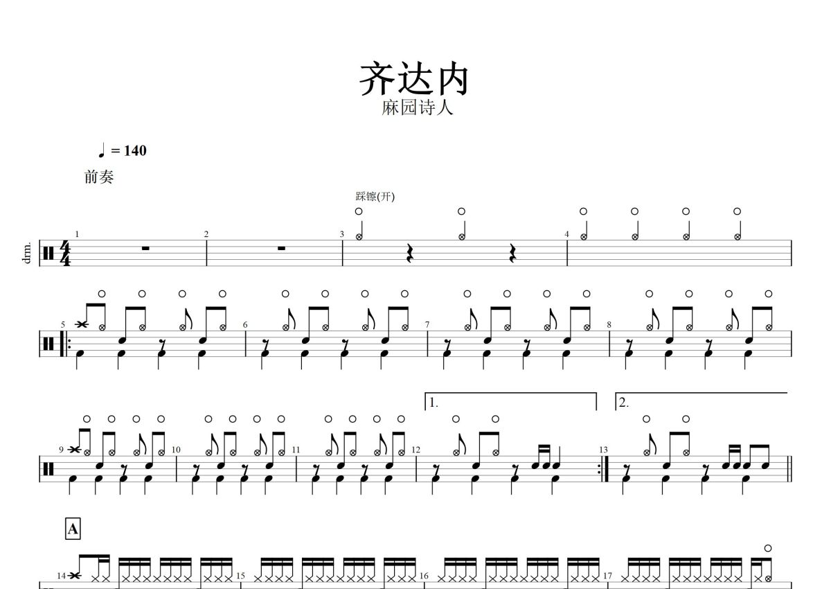 麻园诗人《齐达内》鼓谱 - 架子鼓谱