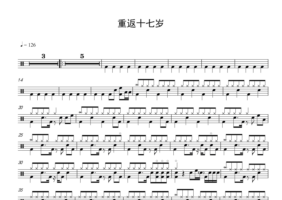 《重返十七岁》是鹿晗/ 大张伟/ Ella[/ 刘敏涛/ 潘玮柏/ 张丹峰演唱的一首歌曲,这份鼓谱共有一张高清图谱,图谱由 @打鼓谱 编配上传,图谱使用五线谱编配,使用这份重返十七岁架子鼓谱,你将能够轻松地敲打出这首鹿晗/ 大张伟/ Ella[/ 刘敏涛/ 潘玮柏/ 张丹峰的重返十七岁,快来尝试吧。《重返十七岁》是爱奇艺与东方卫视、浙江卫视联合倾情打造的大型明星体验式真人秀节目《我去上学啦》的主题曲,两季节目分别于2015年7月16日和2016年6月26日开播,第一季播出平台为东方卫视而第二季播出平台为浙江卫视,由赵佳霖作曲,崔恕作词,全体嘉宾共同参与演唱。