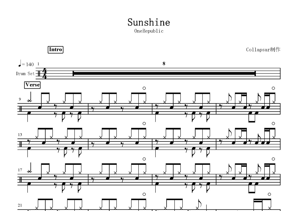 OneRepublic《Sunshine》鼓谱 - 架子鼓谱